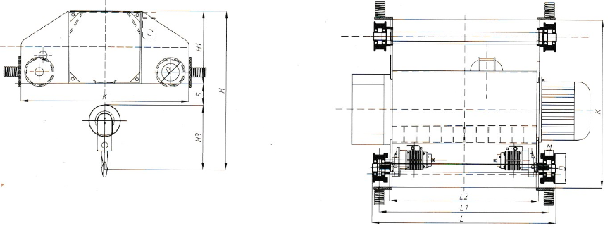 | Cacpacity ton | H1 mm | K mm | S mm | H3 | H | L | L1 | L2 | D | M | Motor power kw | Running speed m/min | Lifting speed m/min |